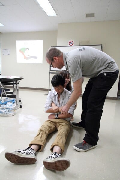 被災現場でのケガや病気に直面したときの傷病対策を学びます。また、救命講習で学んだ内容を踏まえ、応急手当の応用編の実技練習も行ないます。