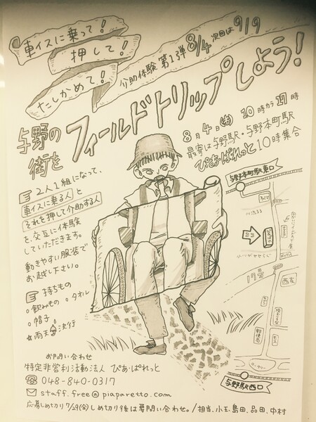2人一組になって車イスを押す人乗る人に分かれて与野の街を散策して頂きます!もちろんただ散策するのではなく楽しいハプニングが次々と起こります。そうやって楽しむ中で自然と福祉のことがわかる、そんなイベントを企画しております!夏休みの素敵な思い出に!良き学びの場として!そんな場を提供できればと思っています!