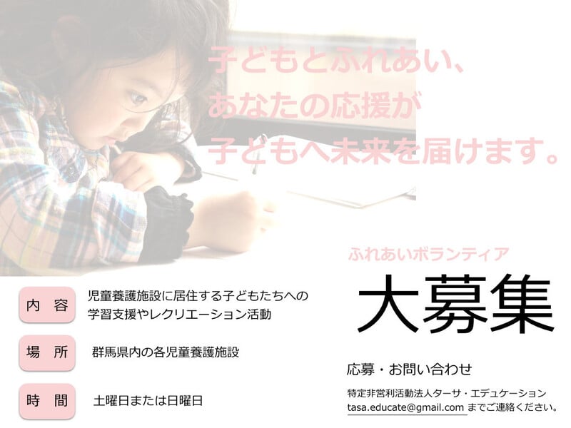 - 子どもの未来を応援しよう!群馬県内の児童養護施設での学習ボランティア!