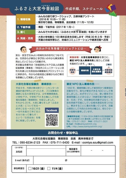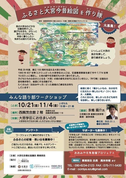 絵を描くのが好きな方、話を聞くのが好きな方、もっと京都・大宮学区について知りたい方、地域の歴史・地理が好きな方、地域で仲間やお友達をつくりたい方…などなど!大宮学区を元気にしたいと思う方、ぜひご連絡を! |