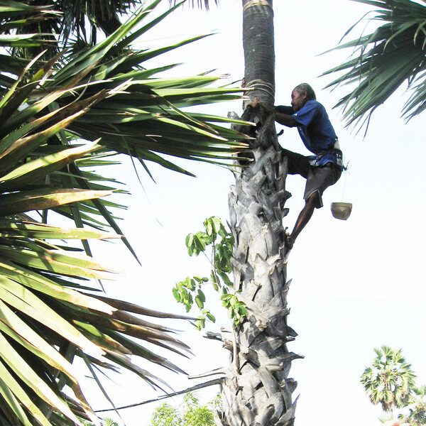 やし砂糖農家がやしの木を登って樹液を採るのを見学します。