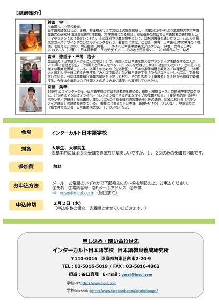 今後の日本の地域コミュニティや社会を考えた時、外国人とのコミュニケーションの問題を抜きに考えることはできません。"交流"や"支援"だけではない、新しい地域づくりの形を、全3回の講座を通して考えていきましょう。