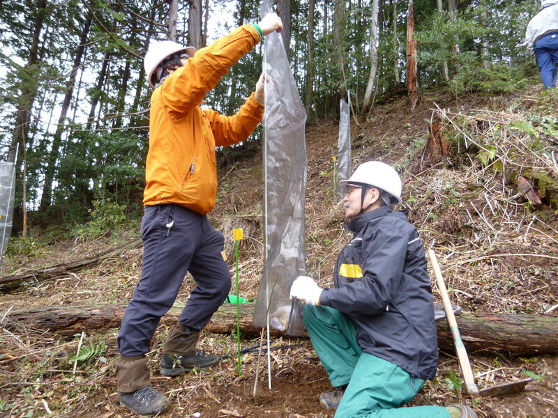 苗木は、鹿などに食べられないように1本ずつ擁護ネットを巻いて行きます。