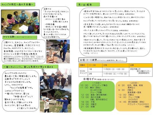 | 10:00 | 15:45 | 奈良市青少年野外活動センター 正面玄関 |