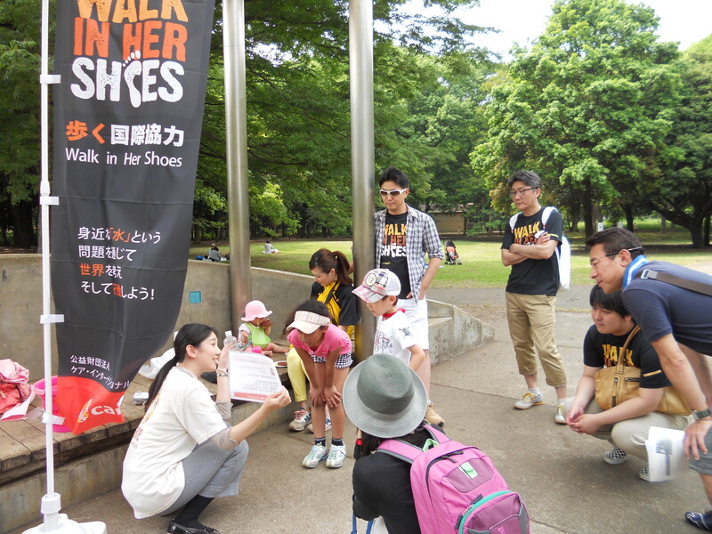 イベントでは、公園内を国際協力に関する楽しいアクティビティポイントを回りながら 途上国の女性、女の子たちが水汲みのために一日に歩く距離、6キロを歩きます。