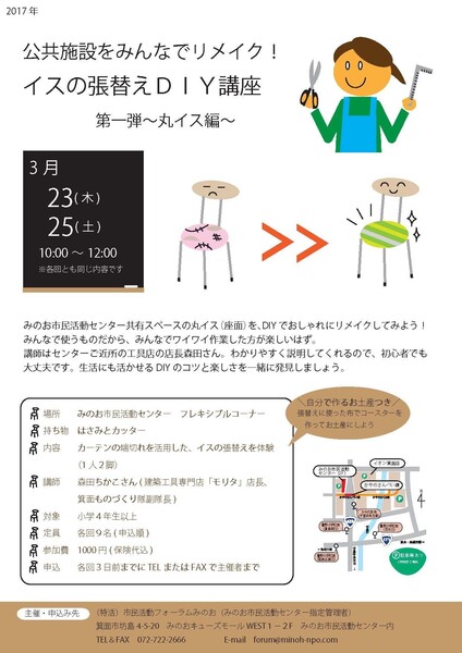 みのお市民活動センター共有スペースの丸イス(座面)を、DIYでおしゃれにリメイクしてみよう!