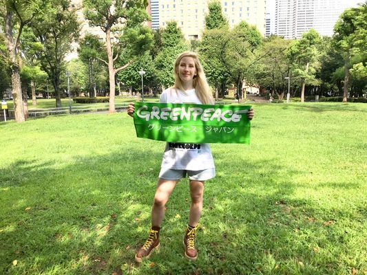 Greenpeaceのバナーを持ってくれたエリーゴールディングさん