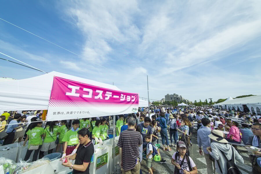 来場者が自分の手でごみ資源を分別できるようにする "ごみ資源の分別ナビゲート" や、ごみの根本削減に取り組む "リユースカップ・食器"の導入など、イベントの環境負荷を下げるための活動をボランティアと一緒に運営しています。