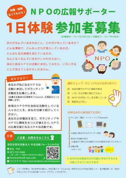 この募集の受入法人「特定非営利活動法人 市民活動フォーラムみのお」をフォローして、