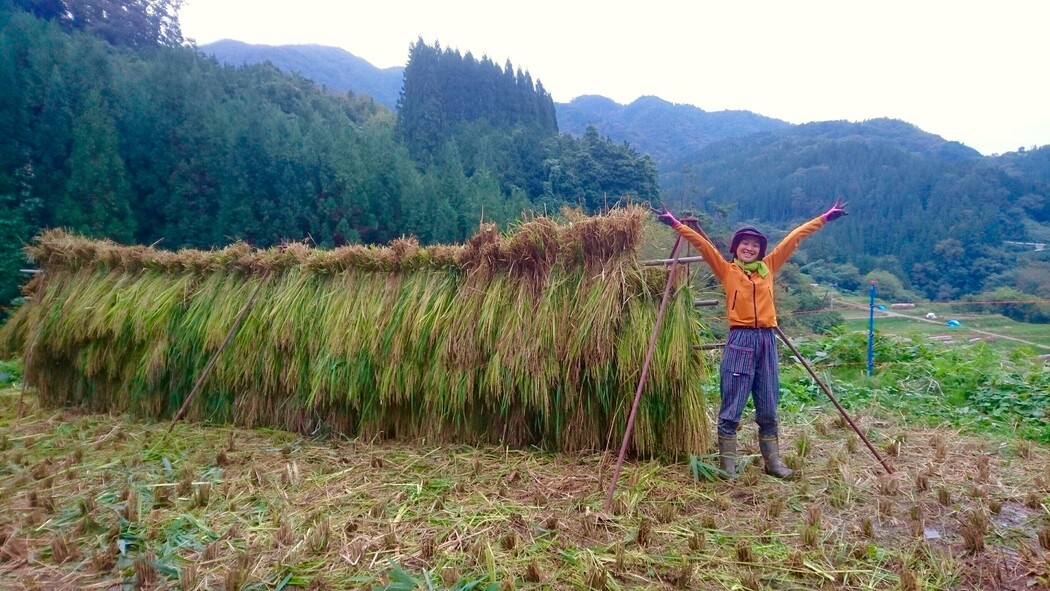 収穫した稲は、「はぜ掛け」という昔ながらの方法で、田んぼにて天日干しし、太陽の力で乾燥させながら、旨みを引き出します。幾段にも積み重ねた稲穂でできる壁は、現代農業では失われてしまった文化。昔ながらの日本の農村で、この季節にしか見られない、貴重な日本の伝統的風景です。