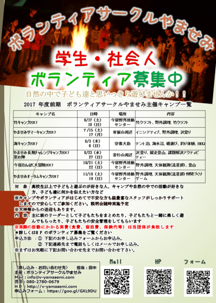 やませみでは、キャンプにスタッフとして参加いただける、高校生以上の方の内、次のどれかに該当する方をキャンプ・ボランティアとして募集しています。 |