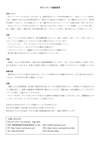 ボランティアサークルやませみ(以下当会)は、福岡市近郊でキャンプ等の野外活動を行い、当会のミッションを達成す る為に、2012 年に設立された野外教育団体です。現在までに 30 回以上の活動を行い、延べ 800 名以上の子どもに、野外教 育を提供してきました。又その活動において、延べ 300 名以上の方にボランティアとして活動に参加して頂いております。 当会は、ボランティアを単なるお手伝いという風に考えておりません。当会のミッションを理解し、しっかり考え、挑み、 悩み、葛藤し、達成し、感動し様々な試行錯誤を繰り返し、ボランティア自身も一緒に成長することを目的としています。体験談・雰囲気