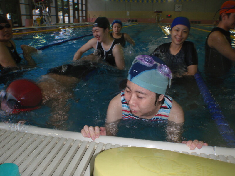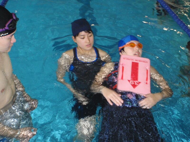 障がいを持つ子どもと触れ合い、和気あいあいとした雰囲気で水泳の練習をしています♪