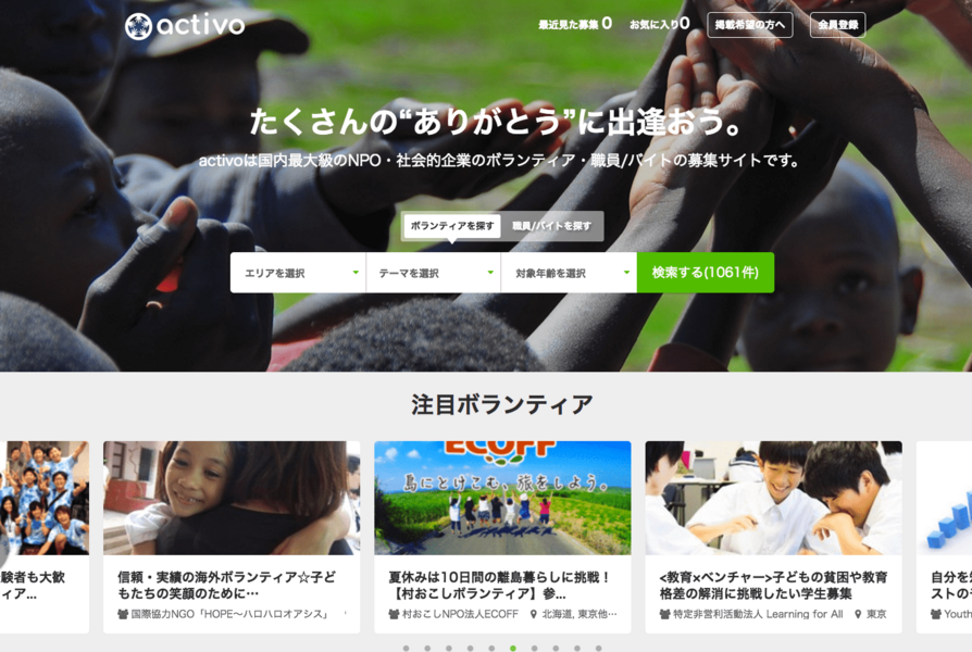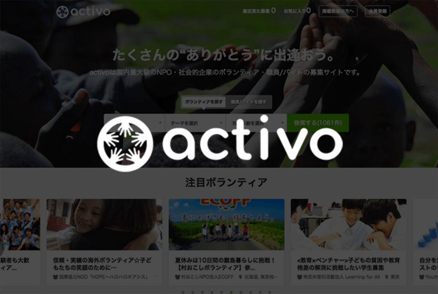 ご覧いただいている国内最大級のNPO・社会的企業のボランティア・職員/バイトの情報サイト、「activo」を運営しています。