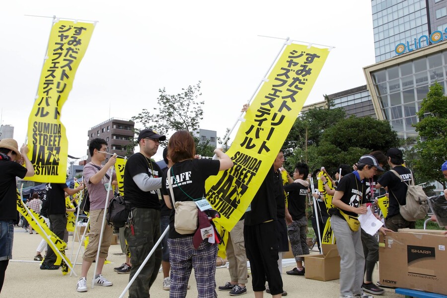 すみだストリートジャズフェスティバルの企画・運営の中心は、元気なボランティアたち。すみだを愛し、自分たちで何かを生み出したいという住民、商店街メンバー、ミュージシャン、企業住民など年齢を問わず様々な人々が一丸となって、当日の会場の設営、交通整理、イベントに関わるすべてにいたるまでの運営を行っております。