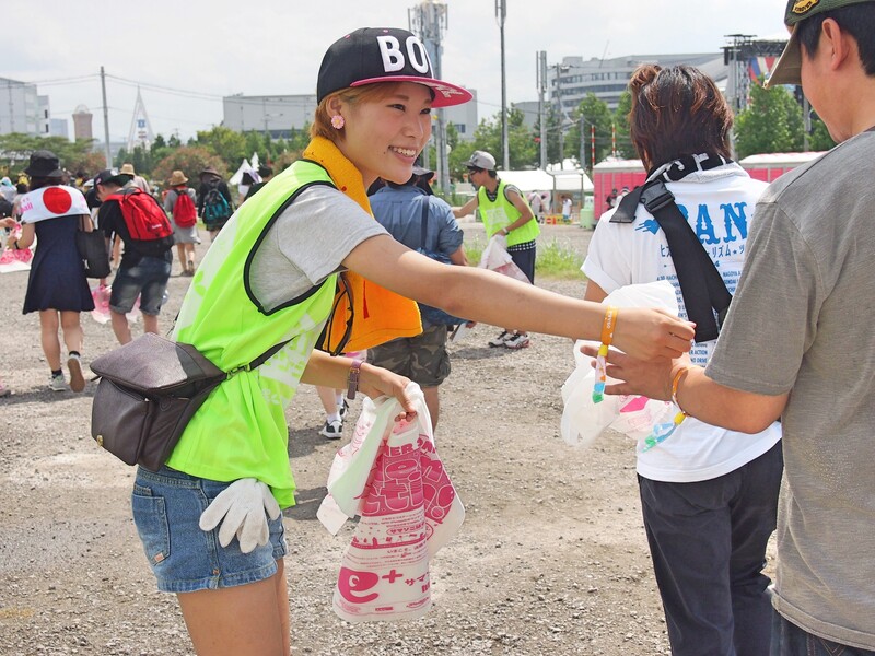 サマソニ特製のごみ袋を、会場の環境対策やメッセージを伝えながら、来場者一人ひとりに配布します。