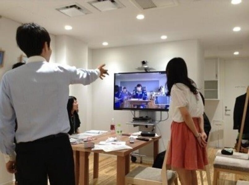 これは、わたす日本橋と、南三陸町の中学校の教室にテレビ会議システムを設置し、日本橋から学生や社会人のボランティアが、Onlineのリアルタイム授業で指導を行う仕組みです。