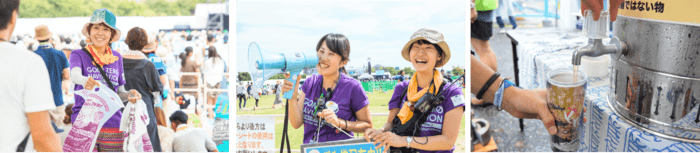 来場者が自分の手でごみ資源を分別できるようにする "ごみ資源の分別ナビゲート" や、ごみの根本削減に取り組む "リユースカップ・食器"の導入など、イベントの環境負荷を下げるための活動をボランティアと一緒に運営しています。