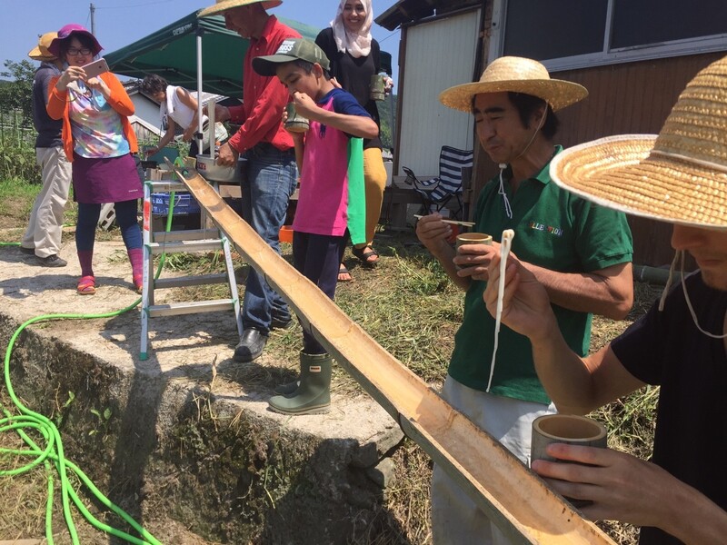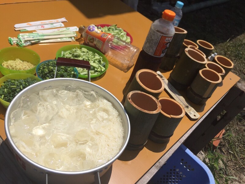 初日の昼食はそうめん流し。自分達で切った竹に水とそうめんを流して、涼しくいただきます!