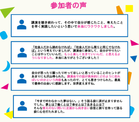 『「社会人だから諦めなければ」「社会人だから周りと同じでなければ」という考えでいましたが、講演会に参加して、自分がやりたいことはやっていいんだ、もっと楽しく生きていいんだ、と思えるようになりました。本当にありがとうございました!』(20代、男性)