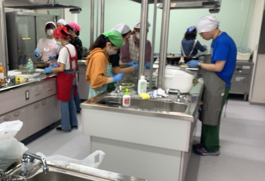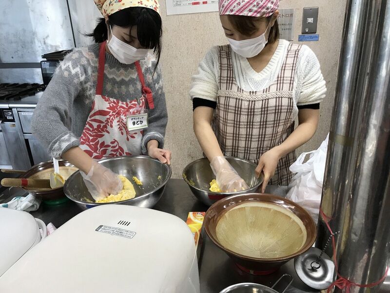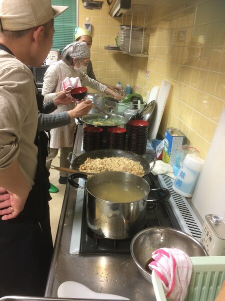 調理のボランティアさんはいつも多数いらっしゃいます。主婦からシニアまで。お喋りしながら楽しくやっています!