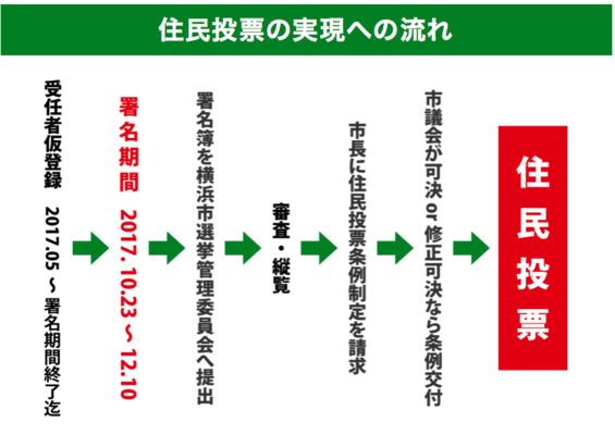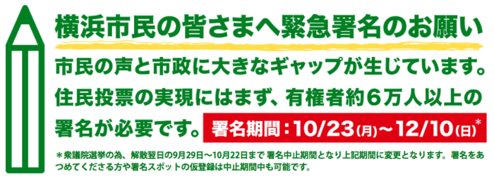 - 私たちは市民の声を横浜市に届ける為に「住民投票」を横浜市で行うことを目指し、横浜市の主要駅で署名運動を日々行なっています。横浜市で「住民投票」実現の為には、横浜市民有権者約6万人以上の署名が必要と言われています。私達と一緒に署名運動に参加し、署名を集めてくれるボランティアを募集しています。