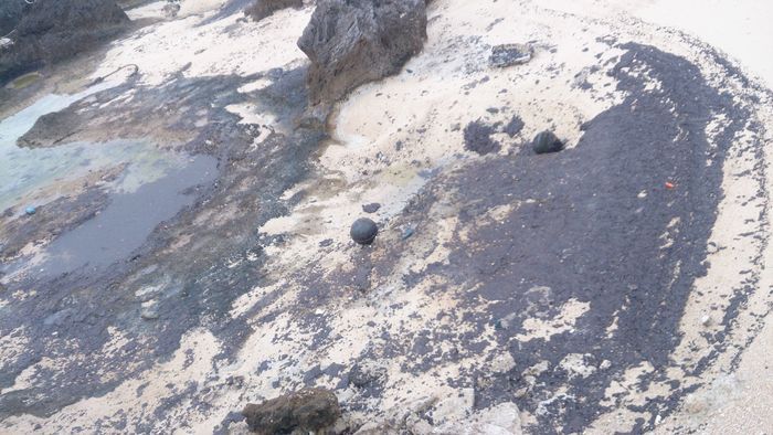1月27日に宝島で油の漂着が発見されました。現在は、島の沿岸ほぼ全域に漂着油が確認されており、回収業者及び島民(業者雇用)で回収作業を行っています。継続的に人の手で油を取り除くひつようがありますが、漂着した油の量が多いため、現状の人数では思うようにはかどらない状況です。