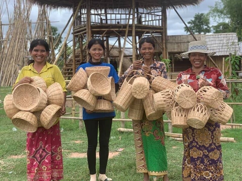 働ける環境作りとして村では竹あかり制作の仕事場を作り、市内ではテーラーさんと共同しカンボジアの万能布クロマーを使用し商品開発を行う。