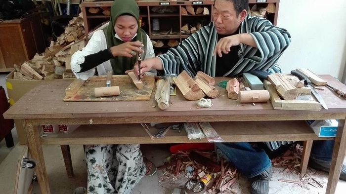 (リボーンアートフェスティバルでアーティストパルコキノシタ氏に木彫りを教わるアチェから来た