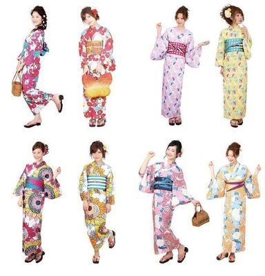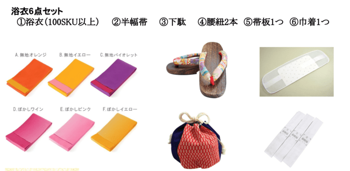 ①浴衣 ②半幅帯 ③下駄 ④腰紐2本 ⑤帯板1つ ⑥巾着1つ