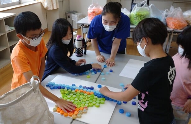 (下の写真は車椅子アメフト体験、ボトルキャップアートの様子です)