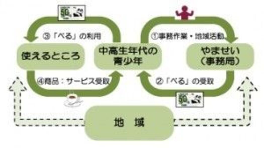 10代の若者が、「地域に関わる活動に参加」(べる活動)し、その評価が受けられるように、対価として見合った地域通貨「べる」を発行します。責任と人に役立つ喜びを学び、体験を通して多様な職業観などに触れ将来を考えるひとつのきっかけになればと考えています。