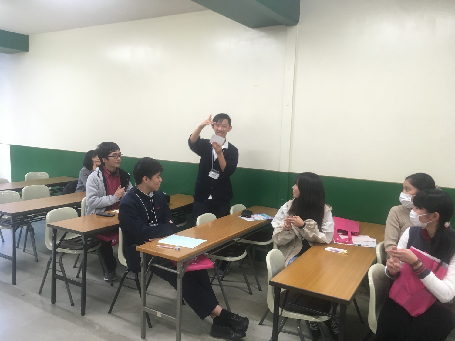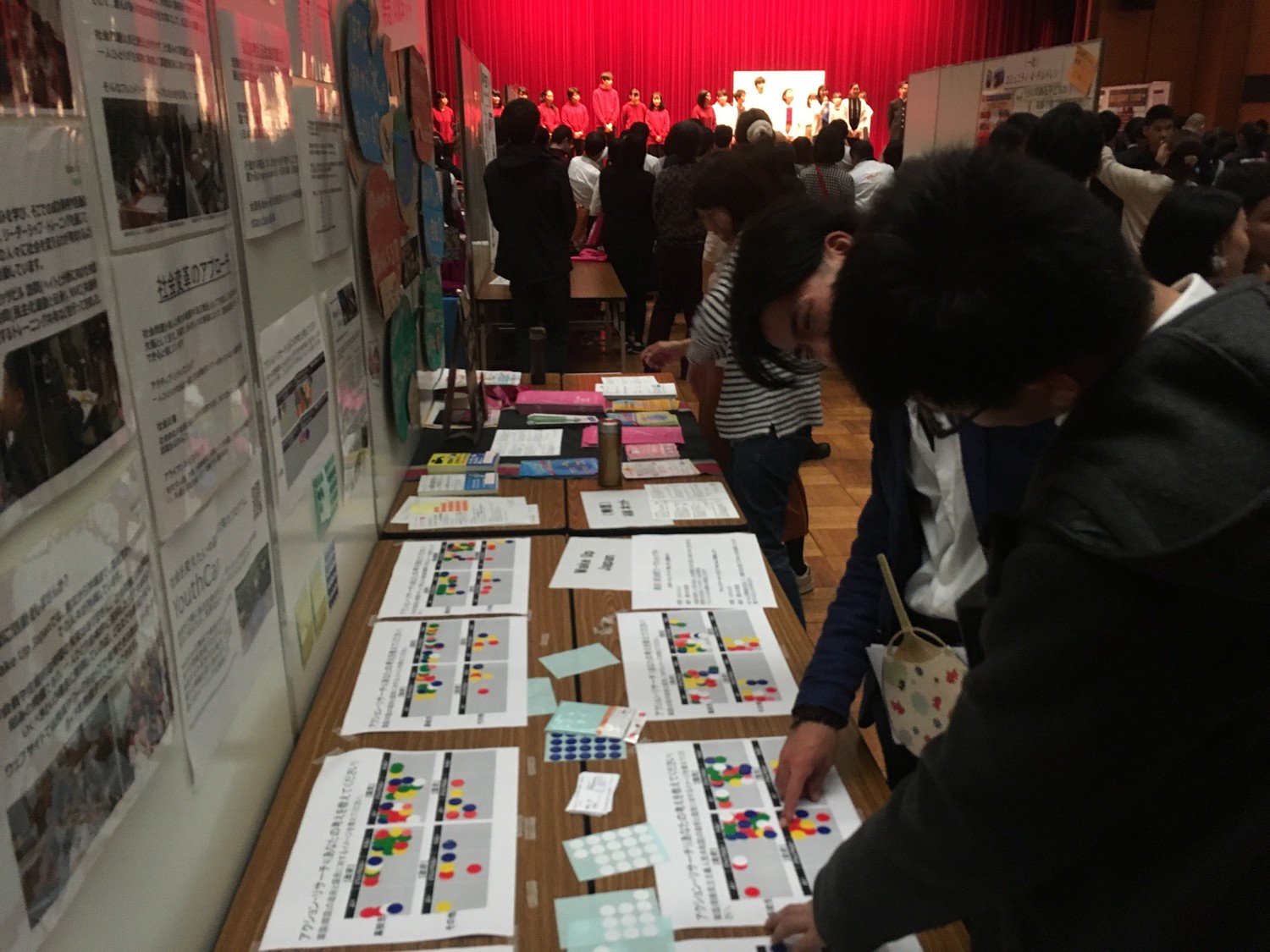活動紹介では、団体説明と共に、アンケートに参加しながら自分たちの意識を深めるアクションリサーチという手法を用いた調査を行いました。「東アジア各国の政府と国民それぞれのイメージ」「気候変動に対する対策を訴えるために学校をボイコットする世界的な若者に関する活動に対するイメージ」などをシールを貼りながら見える化し、訪れた友人同士でその理由を話し合っていました。(穴試合を通じて自分が持つ考えが何によって作られたのか、相手の考えの背景は何かについての理解を深めました。)