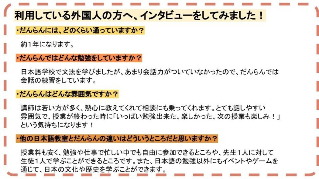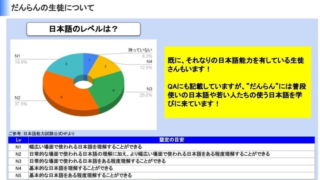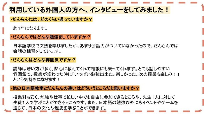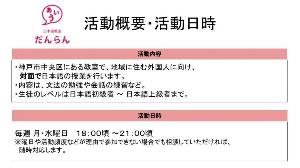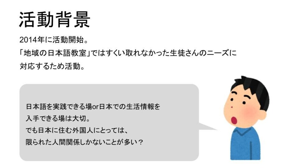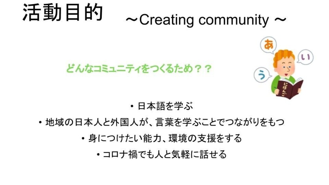 仕事や勉強で日本に来ている外国人が、日本でやりたいことにチャレンジできるために必要な日本語力と相談できる信頼関係を得られる日本語教室を目指しています。