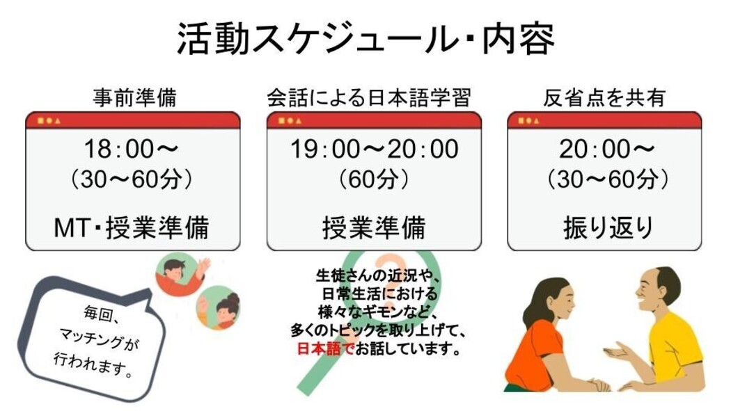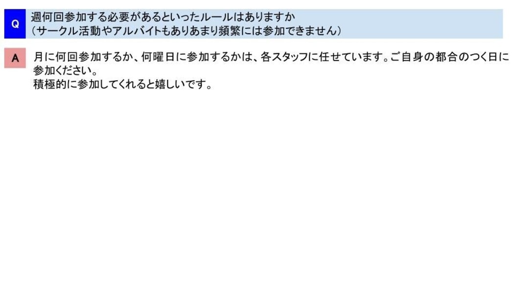 活動頻度:週2回からOK 月曜日か水曜日のいずれかの曜日をお選びいただき、原則毎週参加していただくようお願いをしております。 |
