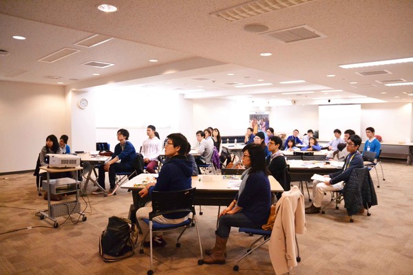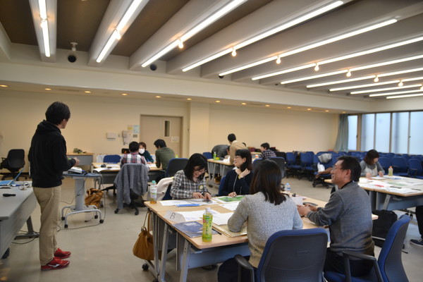 実際にウォーターエイドオリジナル教材を使って授業を実施します。それに備え、ウォーターエイドジャパンが練習会を主催、授業で使用するパワーポイントや素材の内容を確認したり、ピアティーチングを通じて授業実施の練習をしたりします。