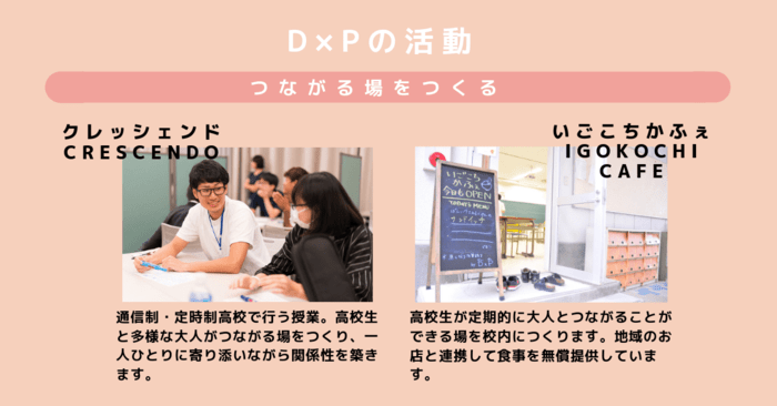 D×Pの事業の全貌はこんな感じ。つながる場をつくる「クレッシェンド」と「いごこちかふぇ」で高校生と出会い、ひとりひとりに必要なプログラムや機会につなげていきます。高校生ひとりひとりの話に耳を傾け、関わってください。