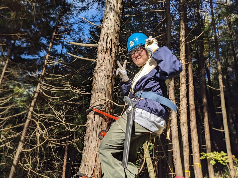 竹林整備、除伐・間伐作業、枝打ち体験はどれも初めての体験で、新鮮でした。手鋸をひくときかなりの力が必要なので、丸太を1つ薄切りするだけで時間がかかり、やっと切り終えたときには、手鋸を握りしめていた掌が真っ赤になっていました。中でも1番印象に残っているのは与作を使っての枝打ち体験です。人生で初めて与作という道具をみて、「こんな腰に綱をつけただけの頼りない道具で木のてっぺんまで登るのは怖い」と思ったけど、いざ使ってみるとちゃんと安全で、昔の人の知恵に関心しました。作業が終わり、みんなで少し山を登った時、周りの山々の紅葉が夕日に照らされてとても綺麗だと感じました。自分たちがこうして美しいと感じている自然は、長い間自然と関わり、守ってくれている人がいるから存在しているものなのだなと思いました。普段は機械で作業をしているようですが、今回、腰や手を痛めながら作業を経験できたことで、自然の強さと内側から向き合えた気がしました。