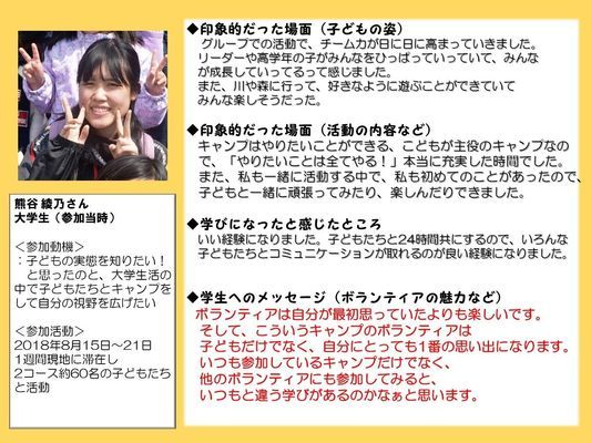 1~2週間程度の期間で継続してふくい夏の自然体験キャンプのボランティアに参加・活動する 「長期ボランティア(実習生)」も併せて募集中です。 詳しくはホームページの情報を参照ください。