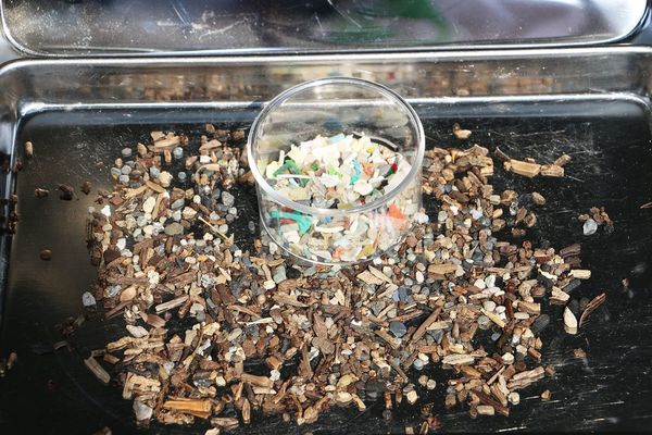 小さなプラスチックゴミを専用の紙コップに何g集められたかを競っております!