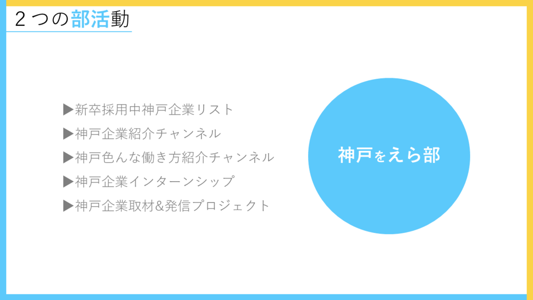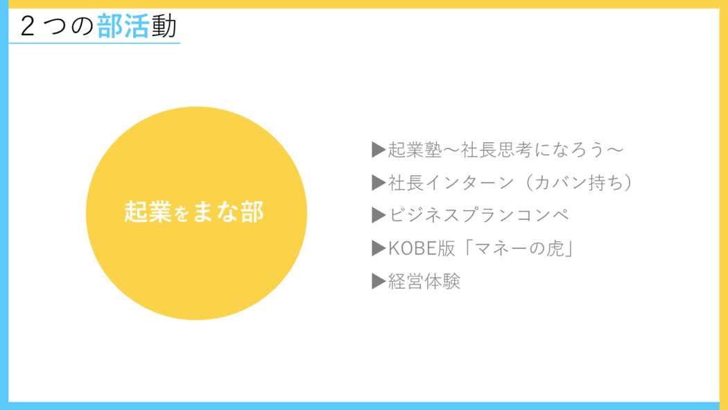 社長の生き方や、会社を経営するとはどういうことなのか、などを学びながらキャリア観を広げていく「起業をまな部」。神戸の企業や神戸で働く人を取材・発信しながら神戸で働く選択肢を探る「神戸をえら部」の二つの部活動を中心に、多様なイベントやプログラムを組成し、多くの学生を巻き込んでいく計画です!