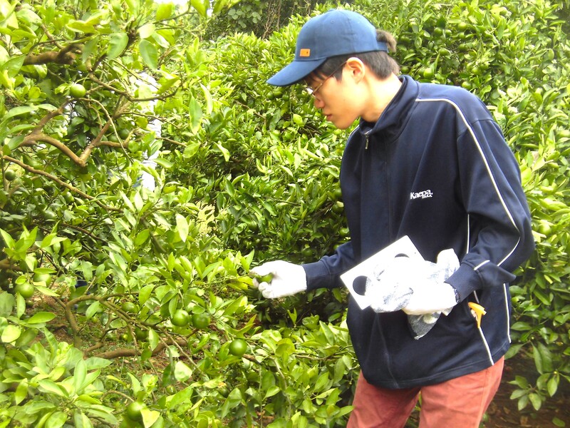 早速みかん農家の人たちの指導で収穫作業を体験した。