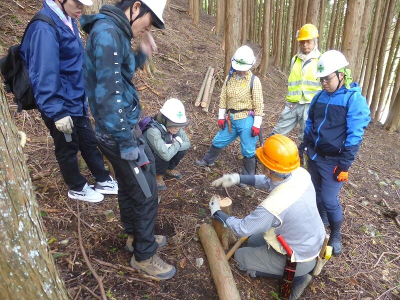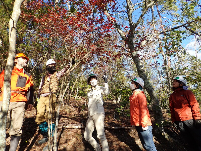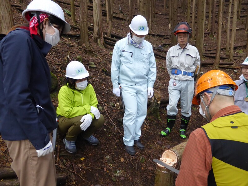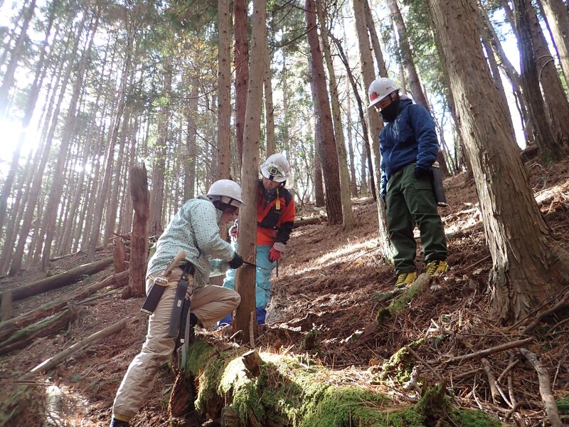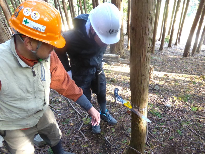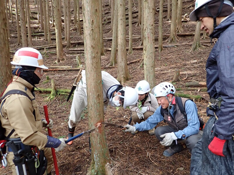 特に学んだことは・・・起こり得る事故の想定、周囲の状況の把握が大切。間伐の際は、将来的に優勢な木の成長の障害となる木の中から、周囲の状況を踏まえ伐倒する木を選ぶなど。