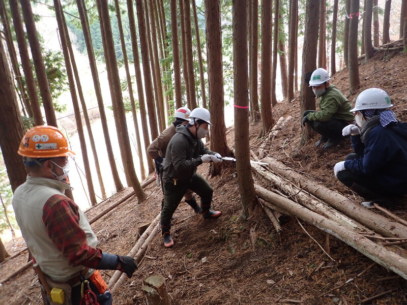 毎月活動しているJUONの拠点なので道具も揃っていて、炭焼きの見学、道具の使い方(杭づくり)、間伐、森林の視察、除伐、道づくりと盛り沢山でした。