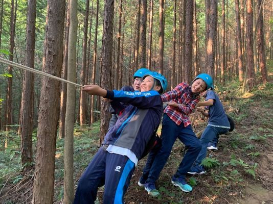 力を合わせてのこぎりや縄で木を切り倒した林業体験。
