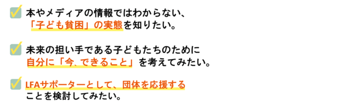 ☑ 今「生まれた環境」により苦しんでいる子どもたちのためにアクションを取ろうと思いました。