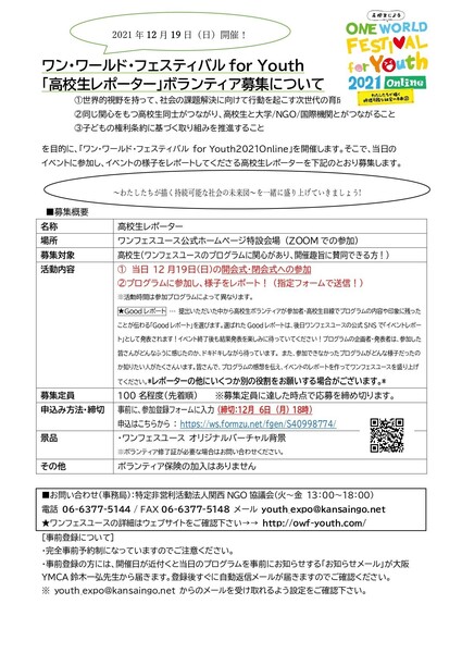 - ワンフェスユース2021を盛り上げる当日高校生レポーターボランティア募集!!