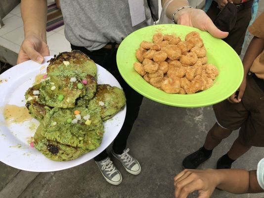 おやつ作りではホットケーキをつくりました。参加者5人で持ち寄った材料と現地で購入した牛乳で料理しました。子供たちも手伝ってくれました。1.5kgのホットケーキミックスで作ったのですが、フライパンが1個しかなかったため、かなり時間がかかりました。交代で焼いたり、調理器具で仰いだりしてどうにか暑さをしのぎました。3時間かけてようやく完成しました。100人くらいの子供が暮らしているので、小さめに分けて出しました。おいしそうに食べてくれました。食事のお手伝いで、サヤエンドウのようなを豆をささがきしました。現地では包丁を使わず、カッターのような器具で行うので難しかったです。