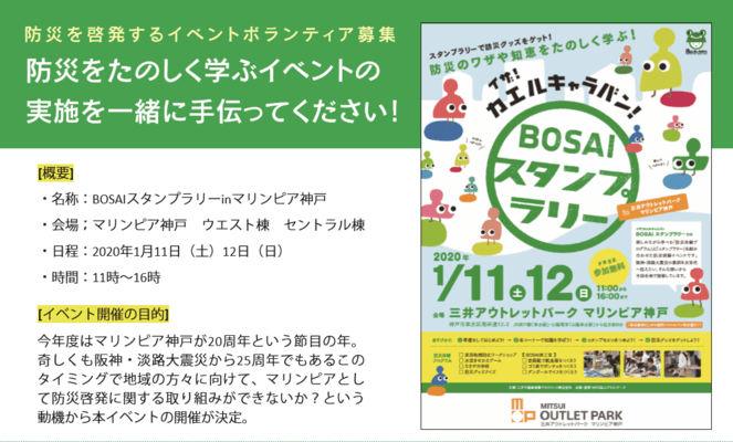 阪神・淡路大震災から25周年でもあるこの タイミングで地域の方々に向けて、マリンピアとし て防災啓発に関する取り組みができないか?という動機から本イベントの開催が決定!ボランティア募集します!