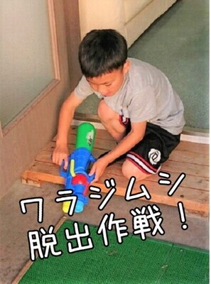 ・・・5分後、ワラジムシは水鉄砲の男の子の誘導のおかげで無事に外に脱出できました。